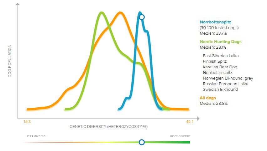 Overall, based on the genetic diversity analysis, it can be concluded that the Finnish Norrbottenspitz population has a higher level of genetic diversity compared to what is observed across all tested dogs, as well as other Nordic Hunting Dogs, in the MyDogDNA database. In fact, Norrbottenspitz is one of the breeds with the highest diversity level observed in the database so far. The result was more or less expected, as the Finnish Spitz Club describes the breed's Finnish population as young and heterogeneous. The most likely reason for the high level of diversity is the maintenance of open stud books; "new blood" has constantly been brought into population. This can be considered positive for the breed's health, vitality and adaptability. It is also worth remembering that genetic differences between individuals form the raw material for selection: Without genetic differences, there will be fewer differences in observable characteristics, and only little variability in breeding material to take the breed forward.