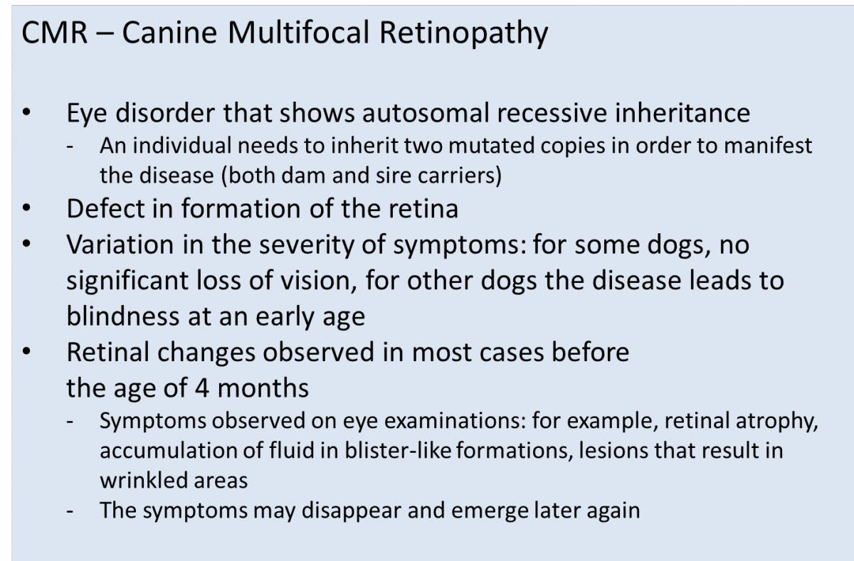 Examples of the spread of a genetic defect and its threats to the health of a population can be found also in real life. The breeding committee of the Finnish breed club ’Suomen Coton de Tulear ry’ has, with the consent of the relevant owners and breeders, recently made public a case in which an imported dog called G-Lavanono Pratele Jetynky (Nono) has been found to be affected for CMR. Another popular male, Merihelmen Komisario Palmu (Nitro) was found to be a carrier for the same disease. CMR (Canine Multifocal Retinopathy) is an eye disorder that can lead to retinal atrophy and blindness (Figure 4). The mentioned two dogs are not the only Coton de Tulears that carry CMR, as about one in ten MyDogDNA-tested Cotons carries the disorder. However, more dogs need to be tested to get a more reliable estimation of the population carrier frequency.