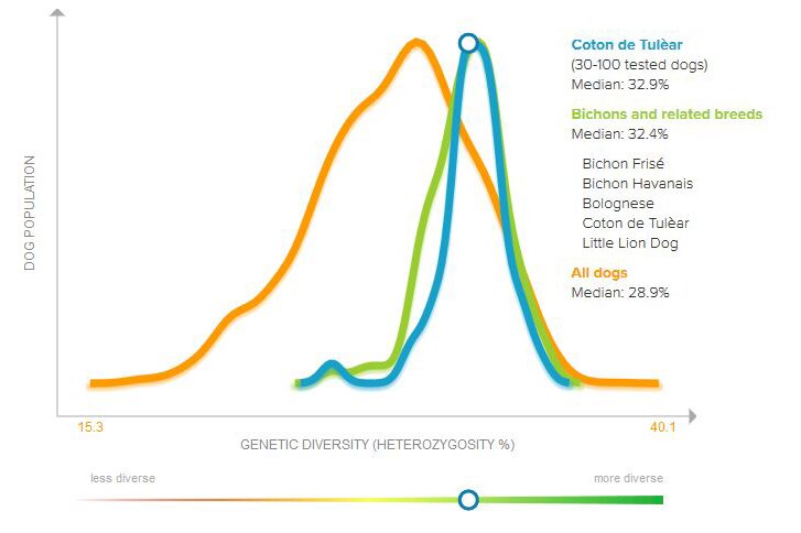 Figure 1. Genetic diversity distribution in Coton de Tulear. The blue curve reflects the genetic diversity distribution in the Coton de Tulear (N = 46). For comparison, the orange curve illustrates the current distribution in all tested dogs in the MyDogDNA database. Other dogs of the same FCI-subgroup offer another point of comparison (green curve).