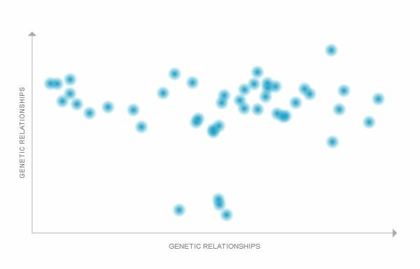 Figure 2. Genetic relationships within Coton de Tulear breed. Each blue dog in the graph represents an individual dog. Dogs that are closer to one another are genetically more similar, while dogs that are further apart are more different.
